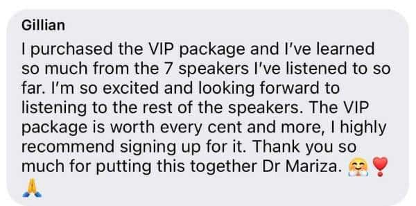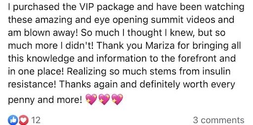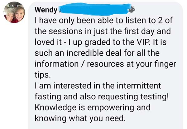 “I bought the VIP pass, so I can listen as many times as I want! I am also looking forward to the book. The biggest thing is that sugar is such a huge problem and that it contributes to so many symptoms.