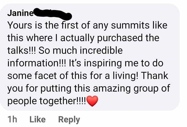 Yours is the first of any summits like this where I actually purchased the talks!!! So much incredible information!!! It's inspiring me to do some facet of this for a living!