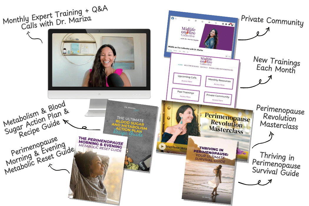 The Midlife on Fire Collective is your monthly anchor—where you get live access to Dr. Mariza, female-first protocols that work WITH your changing body, and a sisterhood that believes your symptoms.